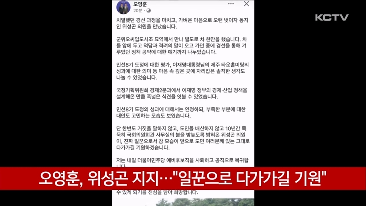 경쟁자였던 위성곤 후보에 지지의 메시지를 보냈습니다.